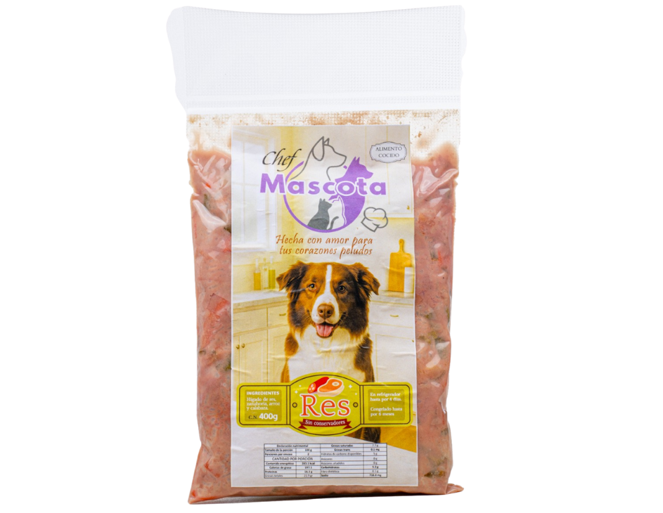 Chef Mascota te ofrece comida casera cocida para tu perro. Lista para calentar en microondas o estufa. Sin croquetas. Sin conservadores. Solo ingredientes frescos como arroz, carne, calabaza y zanahoria.