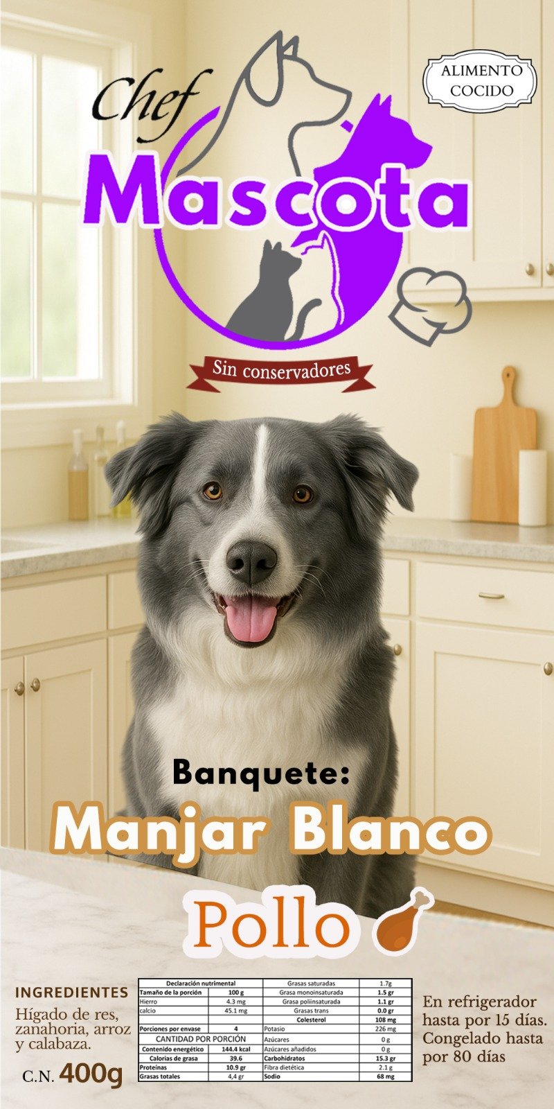 Banquete Manjar Blanco – Pollo es una receta casera elaborada con ingredientes naturales, ideal para perros que prefieren carnes blancas. Cocinado sin conservadores ni aditivos artificiales.